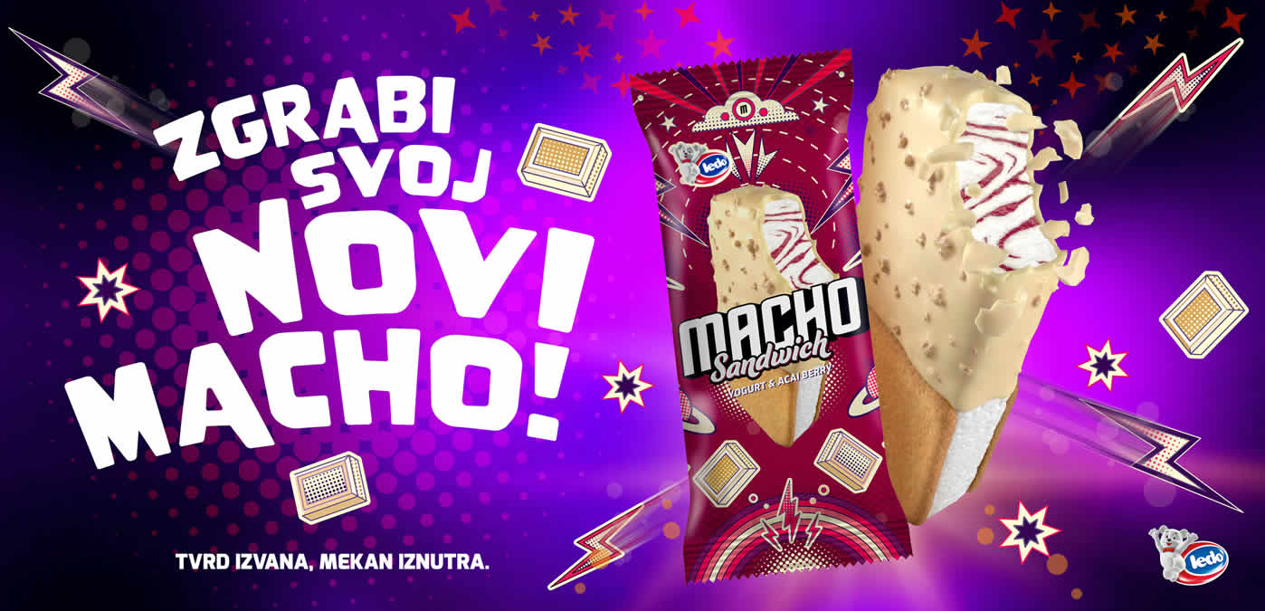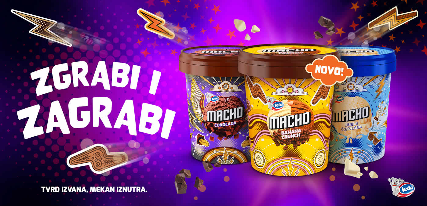 Istodobno, Ledo Macho Banana Crunch dolazi u većem izdanju koje donosi još više užitka u svakom zalogaju. Prepoznatljiva kombinacija sladoleda od banane i biskvita od kakaa s komadićima čokoladnog vafla, uz preljev s okusom keksa od cimeta, sada je dostupna u praktičnoj čaši. Veća količina znači i duže uživanje, a nova forma čini ga još pogodnijim za konzumaciju u pokretu ili tijekom kratke pauze. S novim okusom i većim pakiranjem, Macho još jednom potvrđuje kako pomiče granice klasičnog sladolednog iskustva. Kombinacijom odvažnih okusa, zanimljivih tekstura i kreativnog pristupa, svaki proizvod pretvara se u mali užitak koji ostaje u pamćenju. Ovi noviteti osmišljeni su za sve koji žele više od običnog sladoleda i traže dodatnu dimenziju u svakom zalogaju.